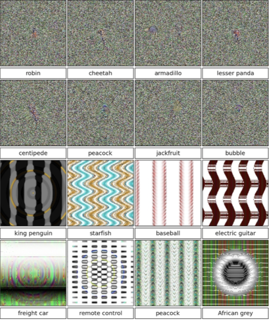 - Абстрактные состязательные примеры - бессмысленные для человека изображения, (например, выглядящие как белый шум или как какие-то абстрактные паттерны), которые нейронная сеть уверенно относит к классу \(y_i\), то есть для изображения \(x\) \(\exists i\), такой что \(f_i(x) \approx 1\). В отличие от двух предыдущих случаев изображение теперь не содержит объекта ни одного из классов набора данных. Поэтому с нашей точки зрения было бы логично ожидать, что для каждого из \(k\) классов нейронная сеть вернет уверенность \(f_i(x) \approx 1/k\). Следовательно присваивание какому-то из классов близкой к единице уверенности является контринтуитивным и нежелательным поведением.