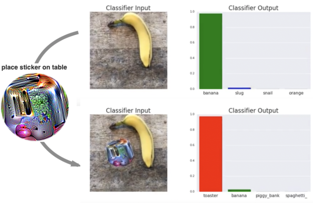 - Наложение состязательных патчей. Определенный регион изображения (квадратный, круглый или какой-то другой по форме) полностью заменяется на специально подобранный патч (заплатку). Обычно предполагается, что такой патч не закрывает сам классифицируемый объект и для человека по-прежнему понятно, что за предмет находится на изображении. Однако нейронная сеть меняет выдаваемый класс.