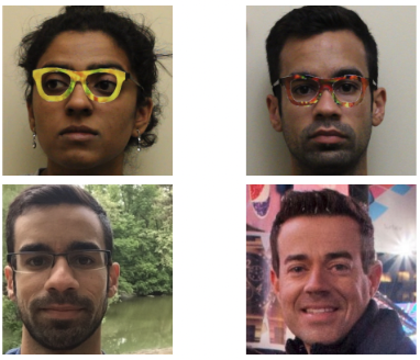 Рис.1 Слева сверху: состязательные примеры для модели AlexNet, обученной на ImageNet. Слева приведены обычные изображения из ImageNet изображения, классифицируемые верно, в центре - вносимый шум, справа состязательные примеры, классифицируемые как страус.Справа сверху: не интерпретируемые изображения, которые нейросеть относит к указанному классу с уверенностью более чем 99.6%. Слева снизу: наложение патча полностью меняет предсказание класса модели VGG-16. Справа снизу: надевание специальных очков приводит к тому, что попавший в камеру человек (сверху), воспринимается нейронной сетью как похожий на совершенно другого человека (снизу).