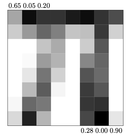 | Кодировка цвета в RGB | Изображение \(\pi\), как вектор \(1 \times 64\) \((0.65, 0.05, 0.20, . . . , 0.28, 0.00, 0.90)\) |