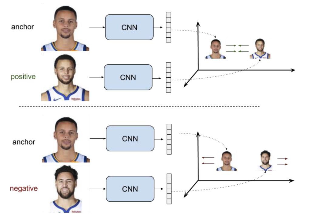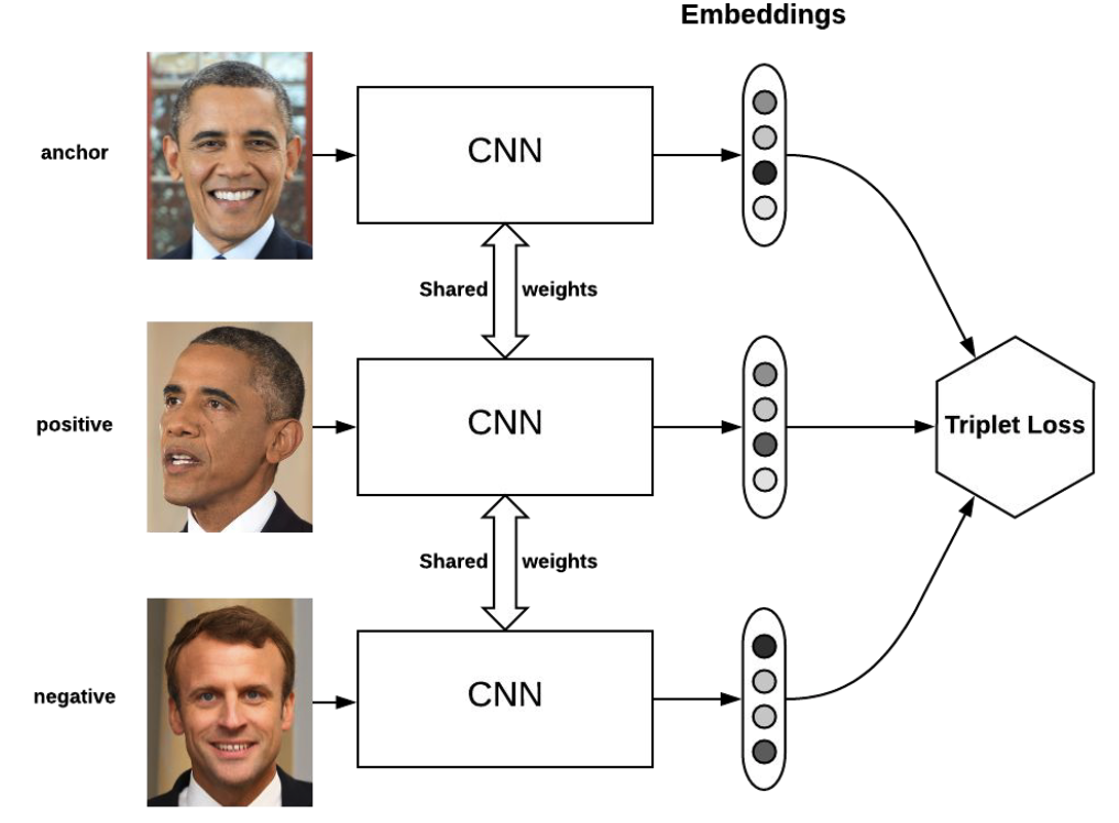 Рассмотрим теперь аналог сиамской сети -- сеть, состоящую из трёх частей с общей архитектурой и одинаковыми весами, которая на вход принимает \(3\) изображения -- якорь, изображение позитивного класса и изображение негативного класса.