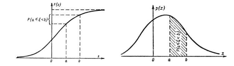 Смысл функции \(p(x)\): если событие «случайная величина \(\xi\) попадет в малый интервал \(\Delta x\)», то вероятность этого события \(\mathbb{P}(x < \xi < x + \Delta x) \sim F'(x)dx = p(x)\Delta x.\) При этом \(\int\limits_{-\infty}^{\infty} p(x) = 1\), так как попадание \(\xi\) в неограниченный интервал гарантировано.