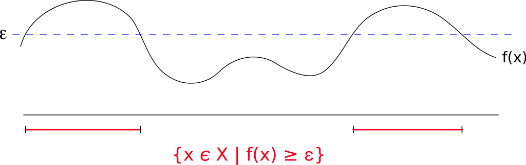 | Функция распределения \(f(x)\) случайной величины \(x\). Зафиксируем положительную константу \(\varepsilon\). Множество случайных величин, где функция распределения больше \(\varepsilon\) закрасим красным. Неравенство Маркова позволяет оценить сверху вероятность попасть в красную зону как \(\frac{\mathbb{E}(X)}{\varepsilon}\) |