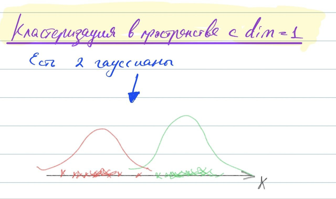 Рассмотрим подробнее на примере. Пусть у нас есть смесь двух гауссовых распределений. \(q\) - вероятность первого гауссового распределения, \(1 - q\) - вероятность второго гауссового распределения. \(f(x|\mu_1, \sigma_1^2)\) - плотность первого гауссового распределения, \(f(x|\mu_2, \sigma_2^2)\) - плотность второго гауссового распределения.