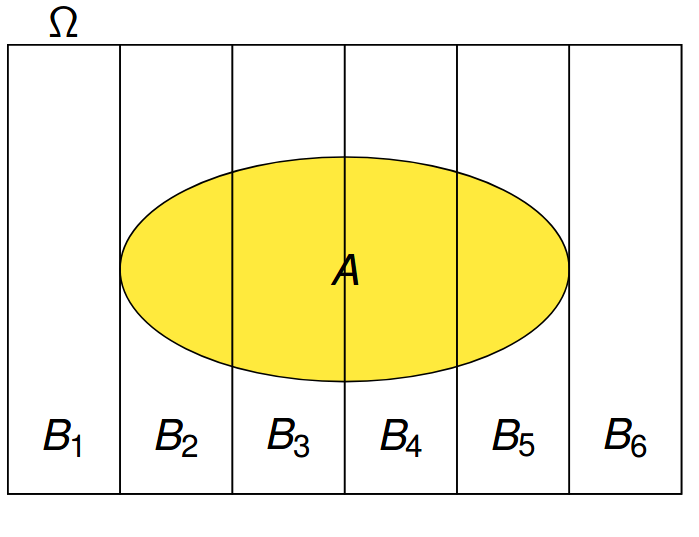 Тогда \(A = A \cap \Omega = A \cap \bigcup\limits_{i=1}^{n} B_i = \bigcup\limits_{i=1}^{n} A \cap B_i\), причем \((AB_i)\cup(AB_j) = \varnothing\)\ Тогда верна формула полной вероятности: